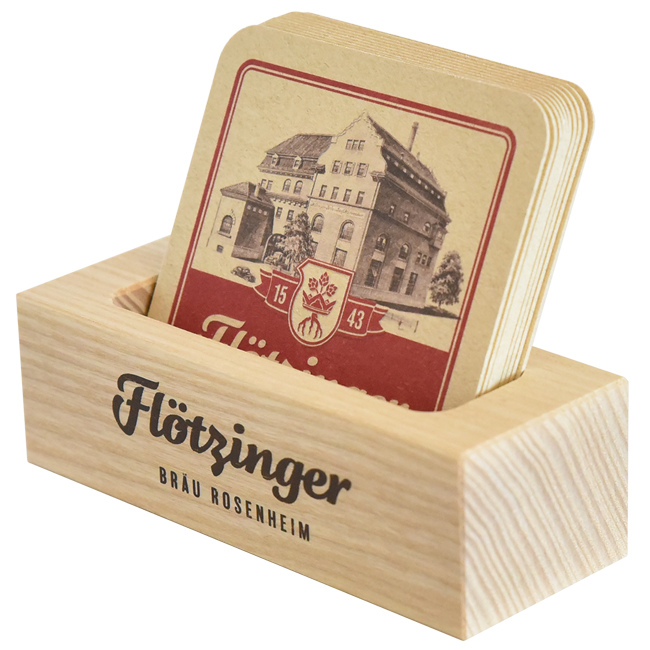 Flötzinger Bräu Bierdeckelhalter aus Massivholz mit Bierdeckel